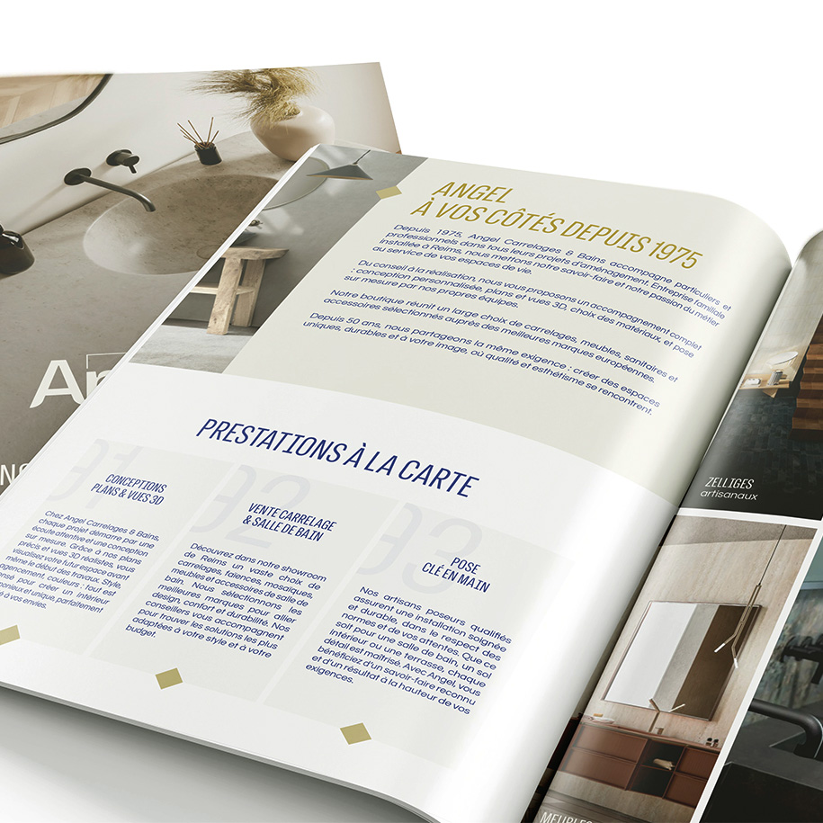 Pour soutenir ce virage stratégique à 180°, nous avons décliné cette nouvelle identité sur l’ensemble de ses supports de communication afin d’assurer une expérience de marque homogène et impactante à chaque point de contact. De la plaquette commerciale aux cartes de visite, du site web aux supports d’affichage grand format (4×3, dibond), jusqu’aux enseignes de façade, chaque élément a été repensé pour incarner la nouvelle image d’Angel : contemporaine, premium et résolument tournée vers l’univers décoratif.